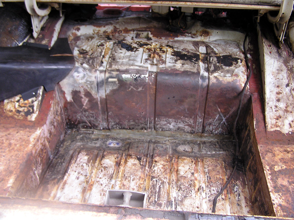 The forward-lower section of the trunk was rusted through. I cut away the bad metal and welded in new metal. A layer of fiberglass was added to seal the deal.